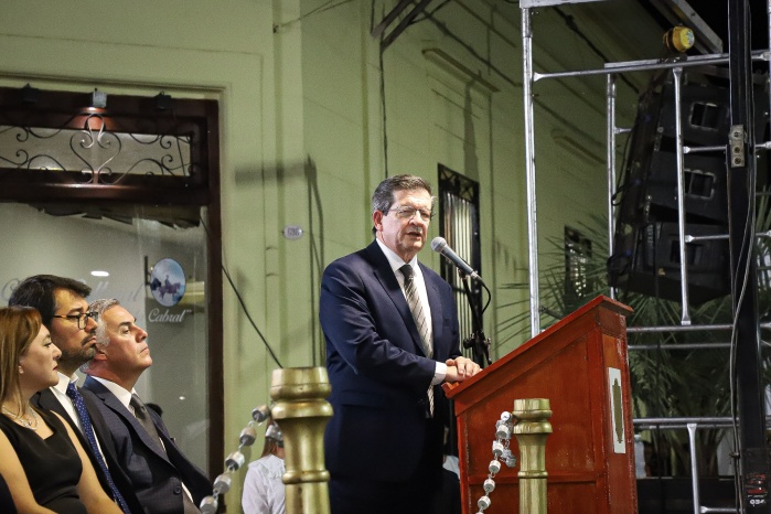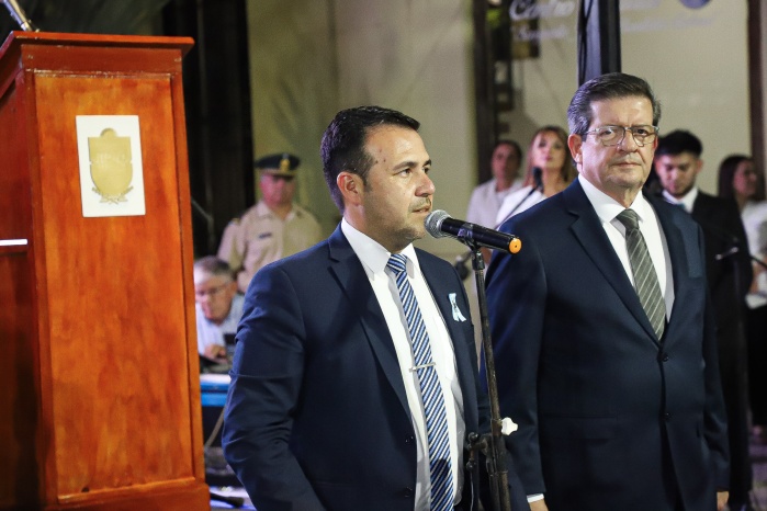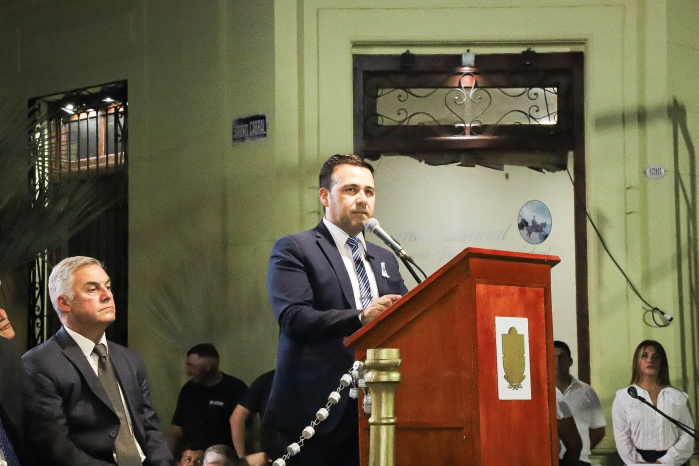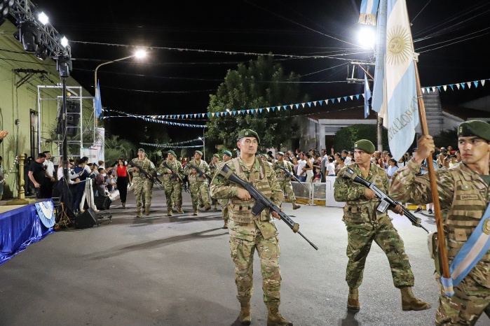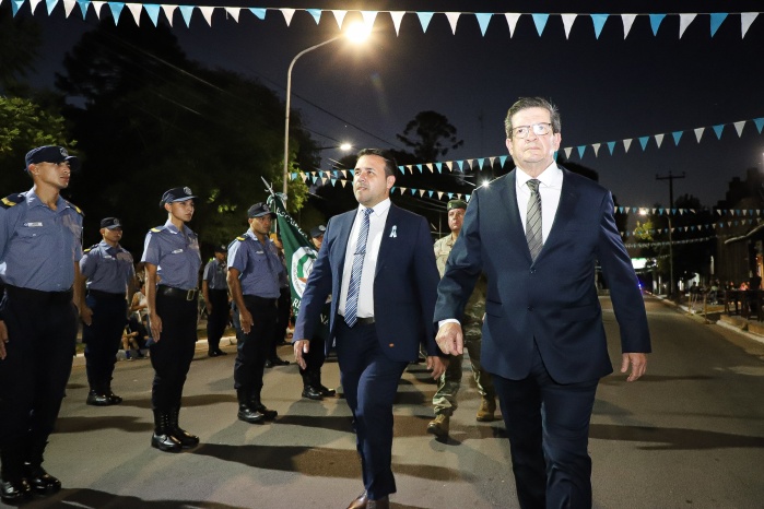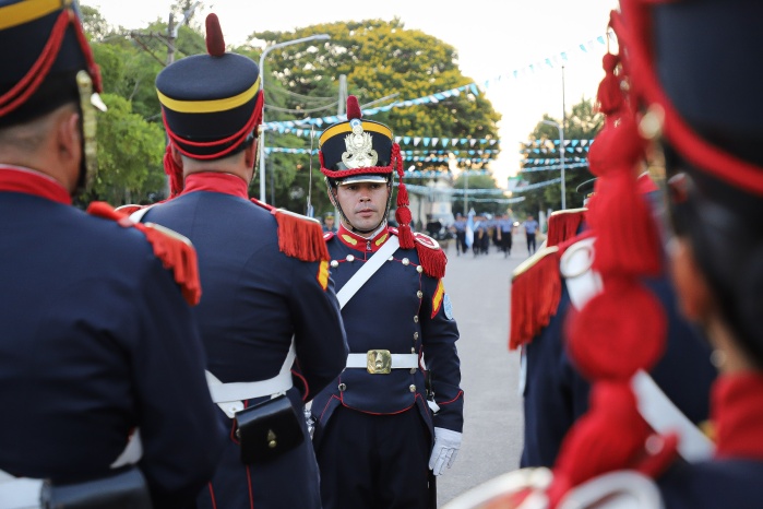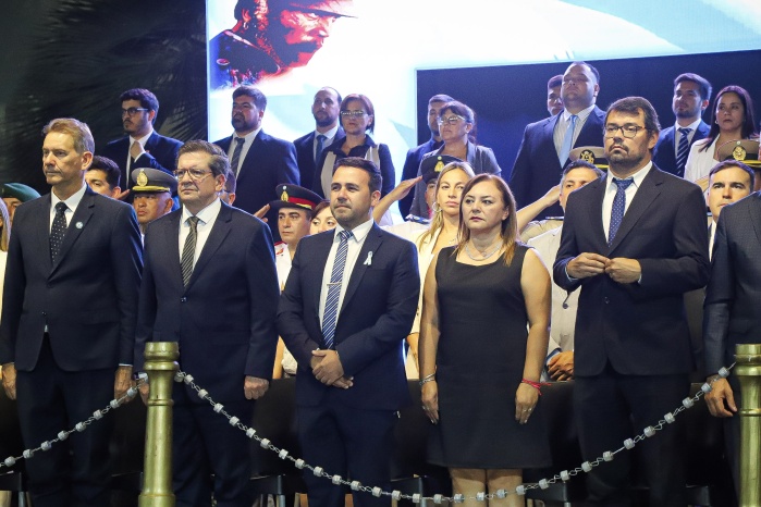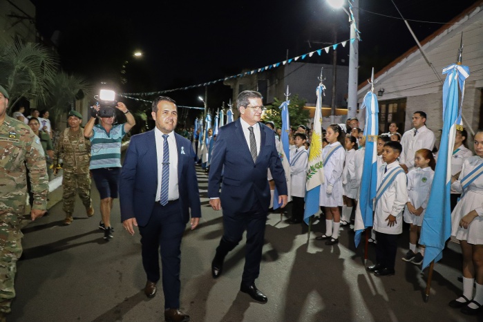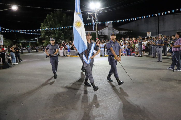 El intendente Noel Gómez junto al Vicegobernador de la provincia, Dr. Pedro Braillard Poccard, encabezó el pase de revista y dieron por iniciado el protocolo, que contó con la entonación del Himno Nacional Argentino, la invocación religiosa a cargo del Vicario Parroquial, Pbro. José Francisco González, y las palabras alusivas a la fecha.
