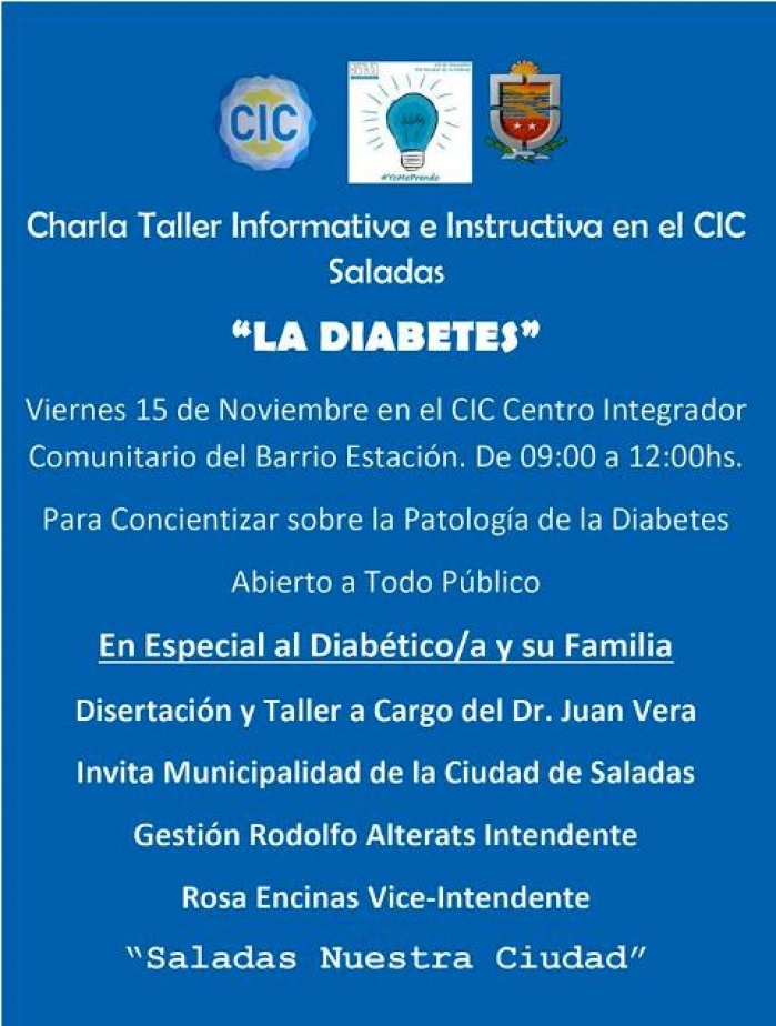 En este marco, la Municipalidad de la ciudad de Saladas, mediante los profesionales del Centro Integrador Comunitario (CIC), situado en barrio Estación, el viernes 15 de noviembre, en el horario de 09:00 a 12:00hs., llevará a cabo una “Charla Taller, Informativa e Instructiva”, sobre “La Diabetes”.